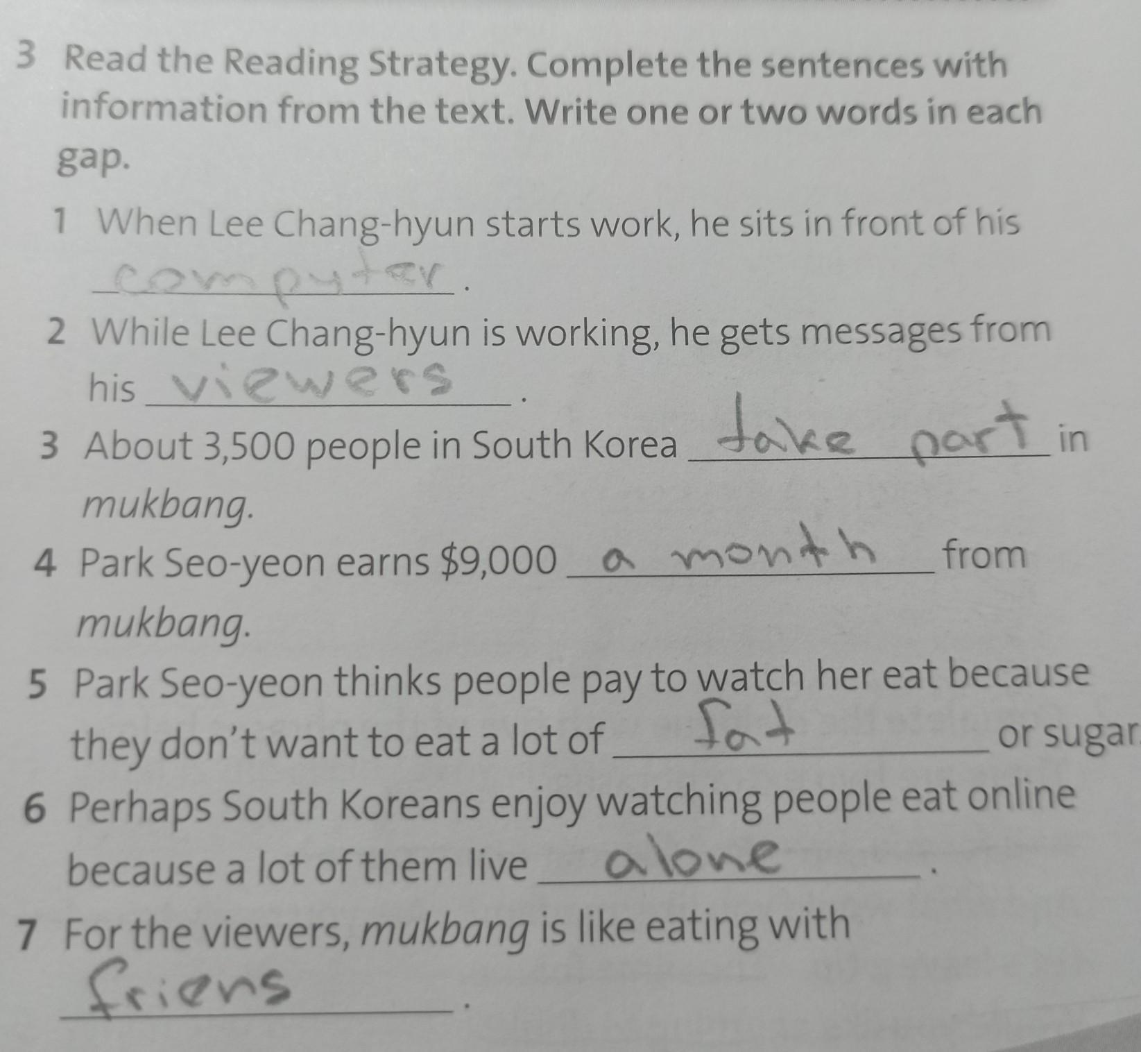 3 Read the Reading Strategy. Complete the sentences with information from the text. Write one or two words in each gap. 1 When Lee Chang-hyun starts work, he sits in front of his ______ 2 While Lee Chang hyun is working, he gets messages from his ______ 3 About 3,500 people in South Korea______ in mukbang 4 Park Seo-yeon earns $9,000______ from mukbang 5 Park Seo-yeon thinks people pay to watch her eat because they don't want to eat a lot of_______ or sugar. 6 Perhaps South Koreans enjoy watching people eat online because a lot of them live_______ 7 For the viewers, mukbang is like eating with_______