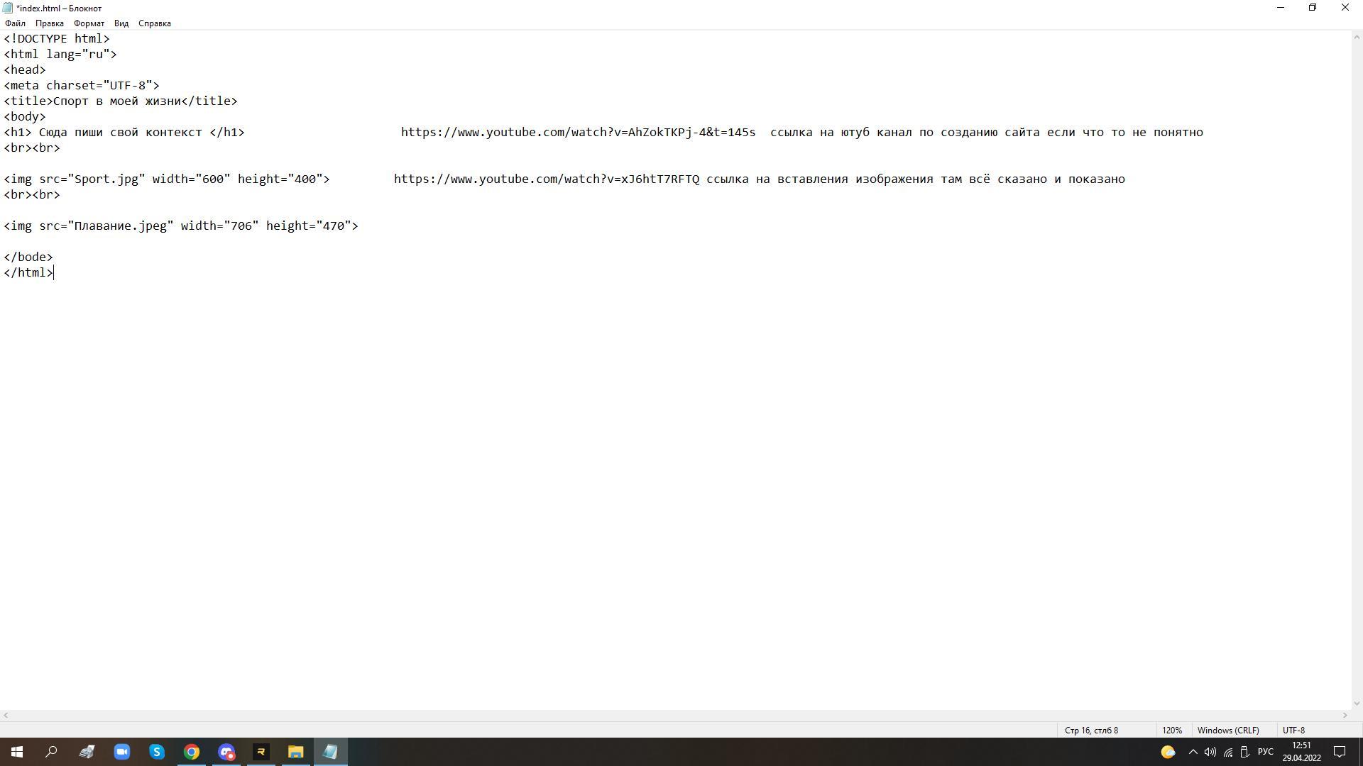 С помощью HTML-разметки создать простейшую веб-страницу на тему «Спорт в моей жизни». На странице разместите информацию о месте спорта в вашей жизни, добавьте иллюстрацию, подходящую по смыслу.