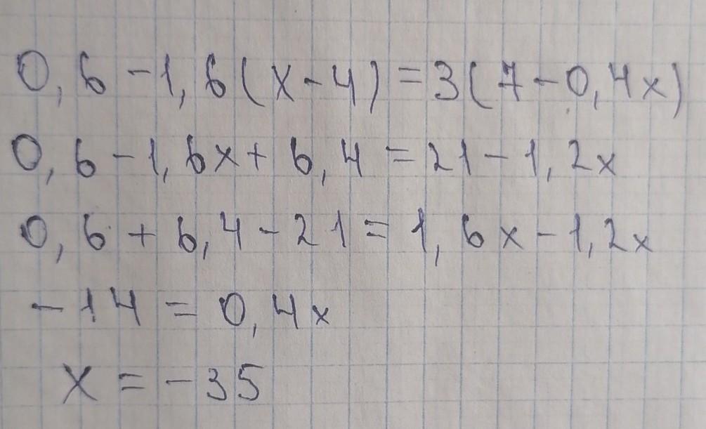 Знайдіть корінь рівняння 0,6-1,6(х-4)=3(7-0,4х).