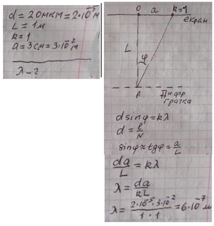 Екран розміщений на відстані 1 м від дифракційної гратки з періодом 20 мкм. Дифракційний максимум першого порядку утворився на відстані 3 см від центрального. Яка довжина хвилі?