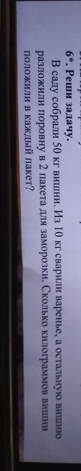 В саду собрали 50 кг вишни. Из 10 кг сварили варенье, а остальную вишню разложили поровну в 2 пакета для заморозки. Сколько килограммов вишни положили в каждый пакет?