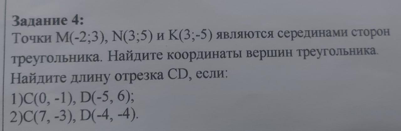 Точки М(-2;3), N(3;5) и К(3;-5) являются серединами сторон треугольника. Найдите координаты вершин треугольника. Найдите длину отрезка CD, если:
