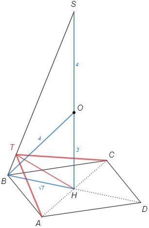 Пирамида вписана, все вершины равноудалены от центра, BO=SO=4