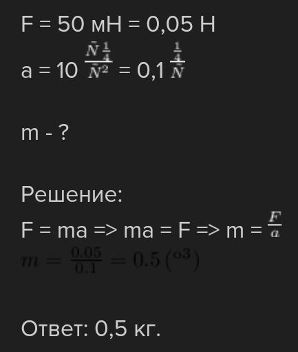 Визначити маск м'яча, якщо під дією 50 Н він рухається з прискоренням 50 м/с2