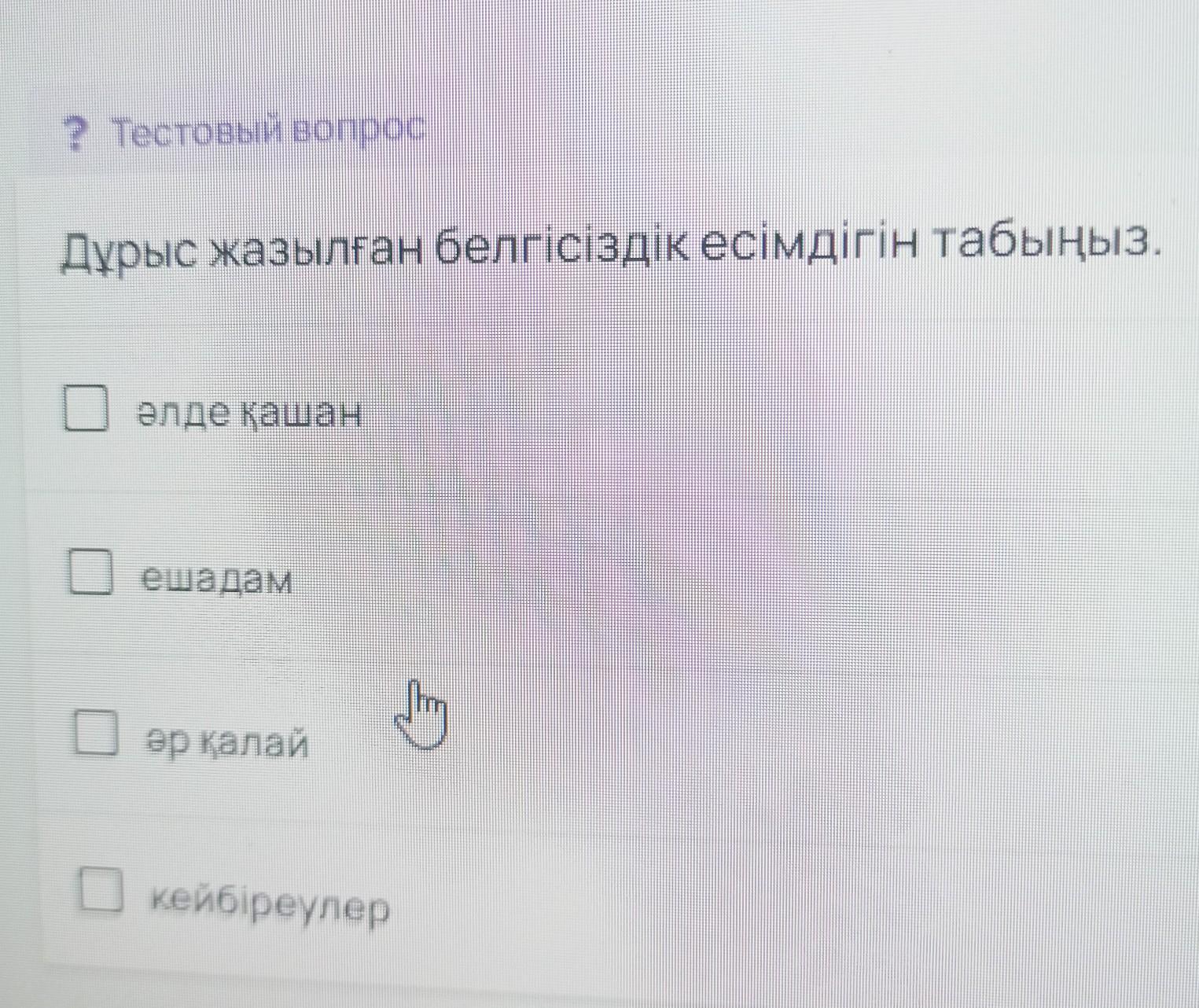 Дурыс жазылған белгiсiздiк есiмдiгiн табыңыз. алде қашан ешадам әр қалай кейбіреулер
