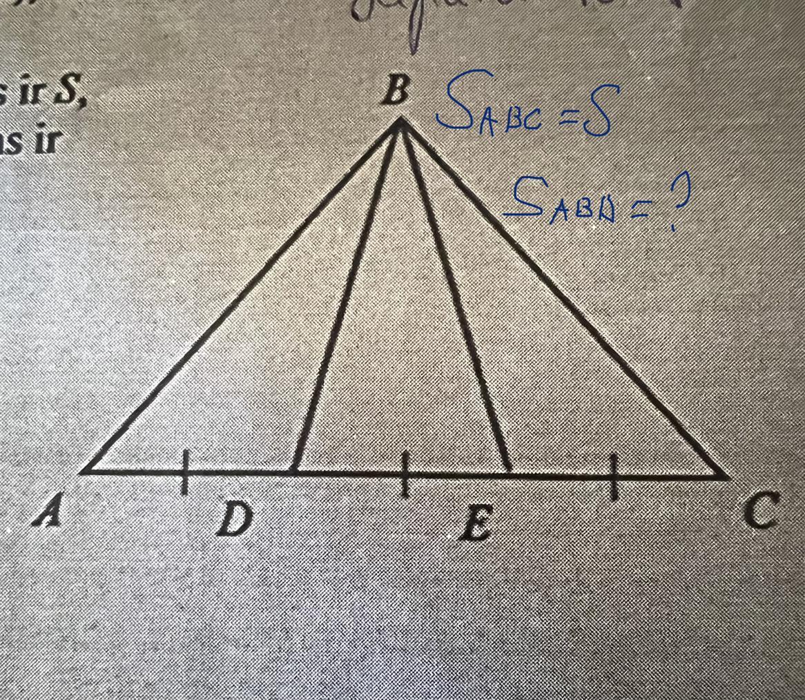 Ааа, ну да, можно опустить высоту, и она будет общая для всех треугольников, следовательно их площади равны