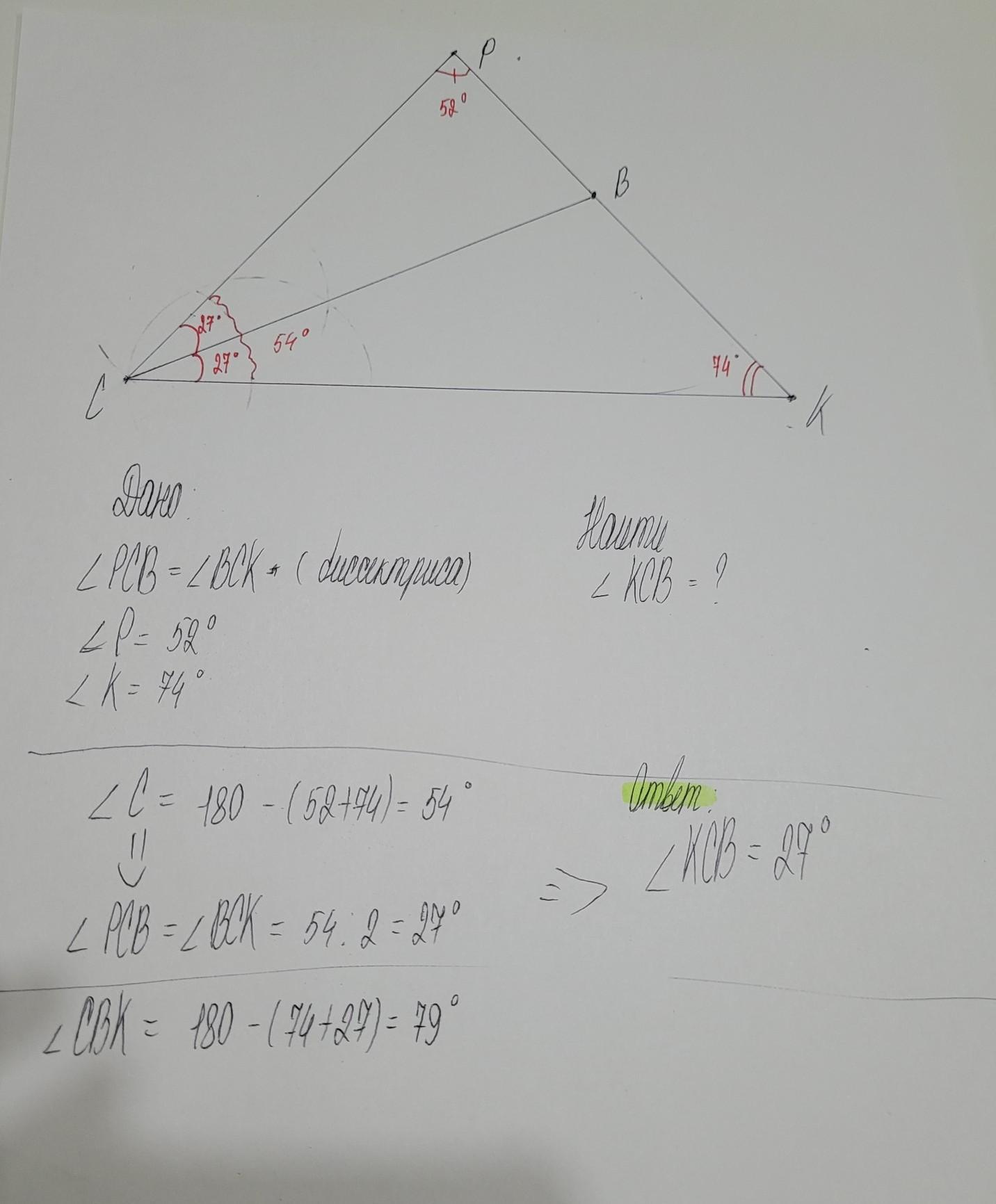 СРОЧНО!!! В треугольнике CPK проведена биссектриса CB (точка В лежит на стороне PK) Чему равен угол KCB, если известно, что угол Р равен 52°,а угол К равен 74°?