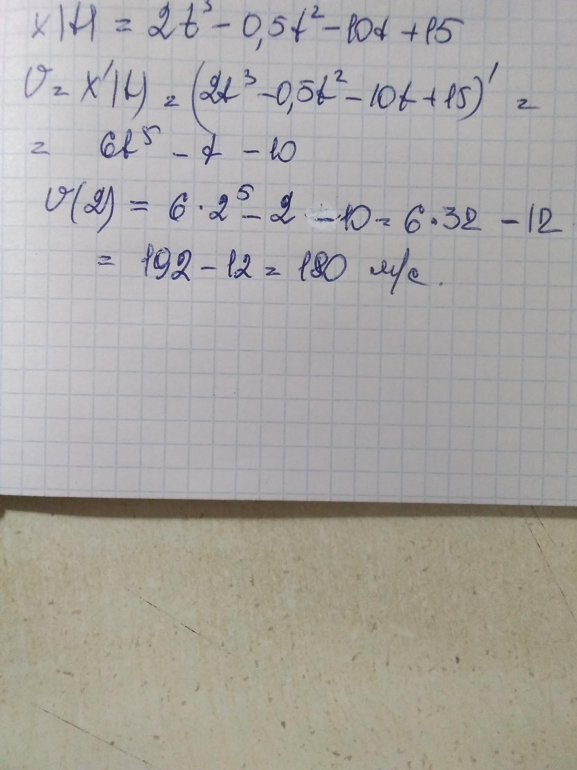 Точка движется по координатной прямой по закону икс модуль t равно 2t^3-0,5t^2-10t+15,где икс модуль t координаты точки в момент времени t ,найдите скорость точки через 2 секунды после начала движения
