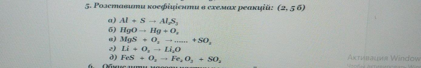 5. Розставити коефіцієнти в схемах реакцій: (2,5 a) Al + S – Al.S, б) Hgo - Hg + 0, в) MgS + 0, + SO, г) Li + 0, — Li,0 д) Fes + 0, - Fe, 0, + SO, или