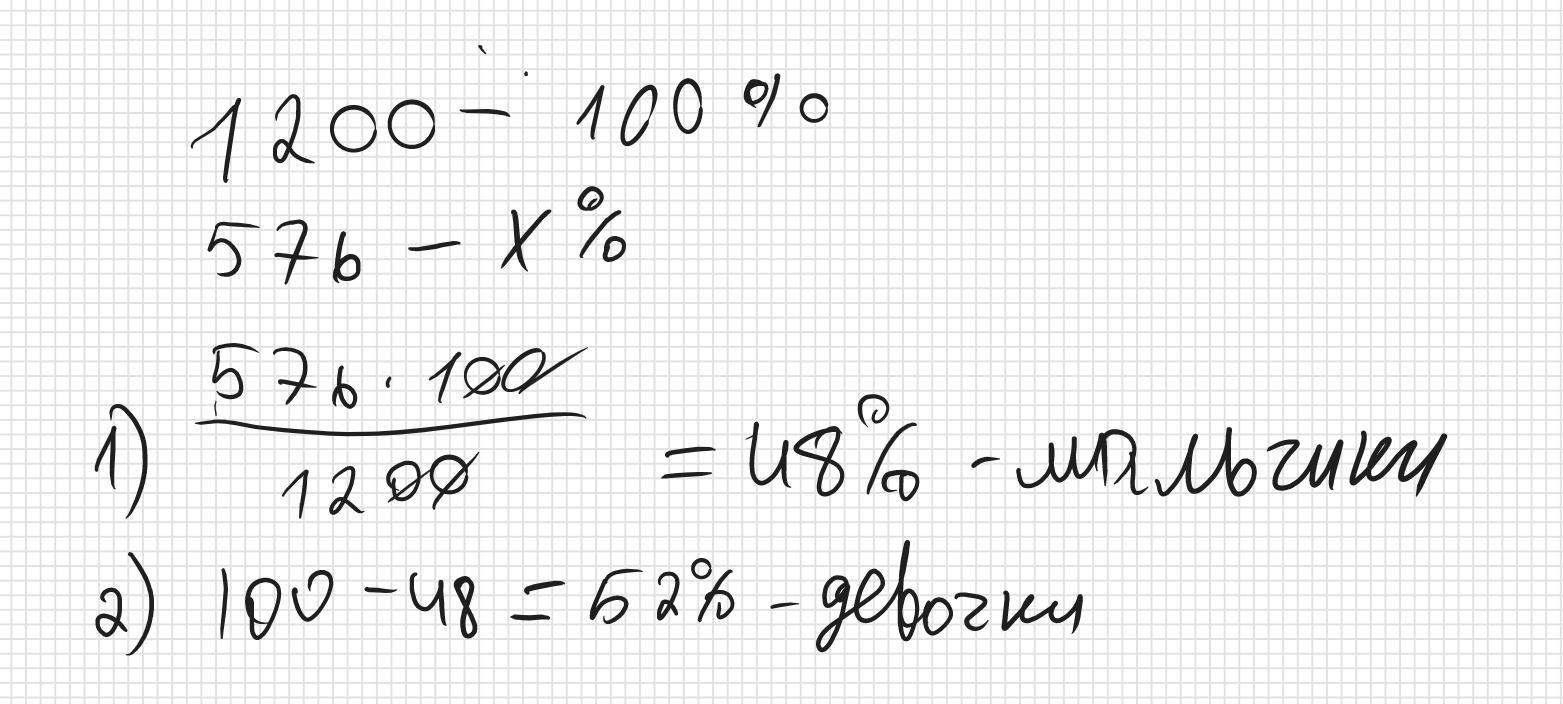 В школе 1200 учеников из них 576 мальчики, сколько процентов этой школы составляют девочки