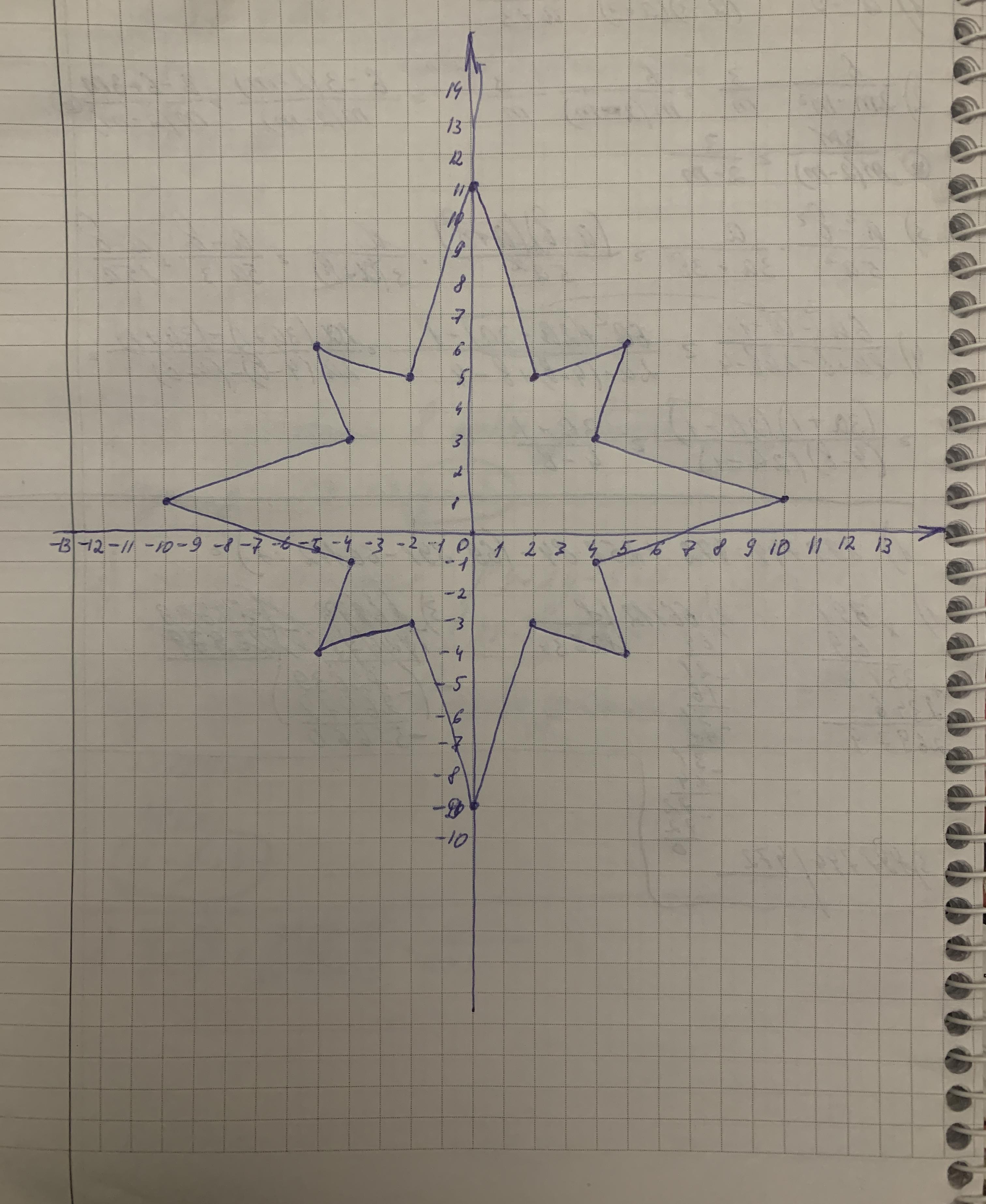 №1 Постройте фигуру, последовательно соединяя точки: (0;11); (2:5); (5:6); (4:3); (10;1); (4;-1); (5,-4); (2-3); (0;-9); (-2;-3); (-5;-4); (-4;-1); (-10;1); (-4;3); (-5:6); (-2;5); (0,11)