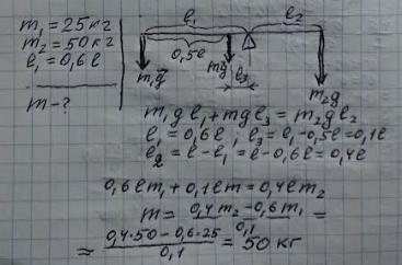 Два хлопчика – маленький масою 25 кг і великий масою 50 кг гойдаються на врівноваженій дошці, сидячи на її кінцях. Відомо, що точка опори знаходиться на відстані 0,6 довжини дошки від маленького хлопчика. Визначити масу дошки
