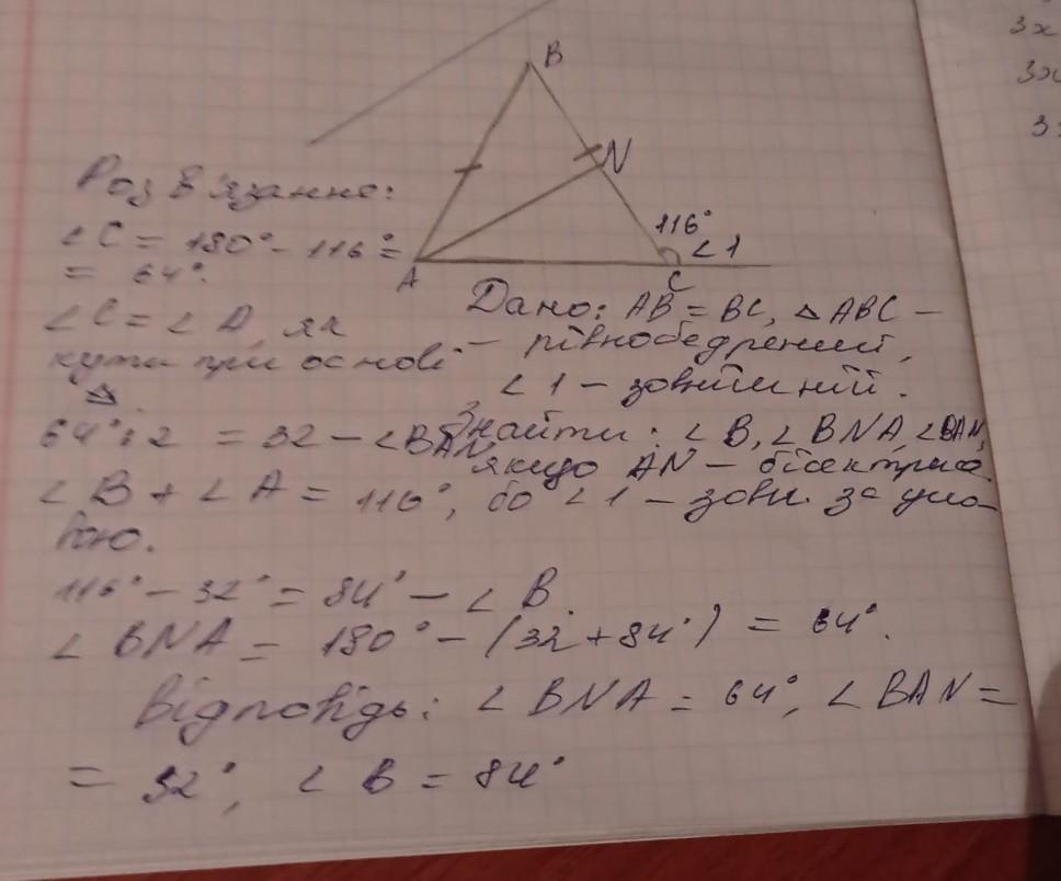 2) Зовнішній кут при основі рівнобедреного трикут- ника ABC (AB = BC) дорівнює 116°. AN — бiсектриса трикутника АВС. Знайдіть кути три- кутника ABN. срочно!!!!!!!;