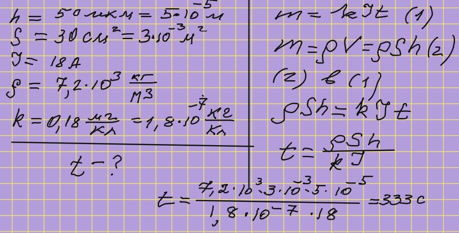 потрібно вкритий шаром хрому завтовшки 50 мкм.скільки триває покриття якщо сила струму дорівнює 18А,а площа поверхні 30 см2
