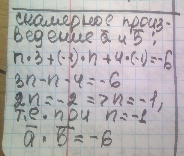Дано вектори а (n; -1;4) i b (3; n; -1). При якому значенні n виконується рівність вектори а × b = -6?
