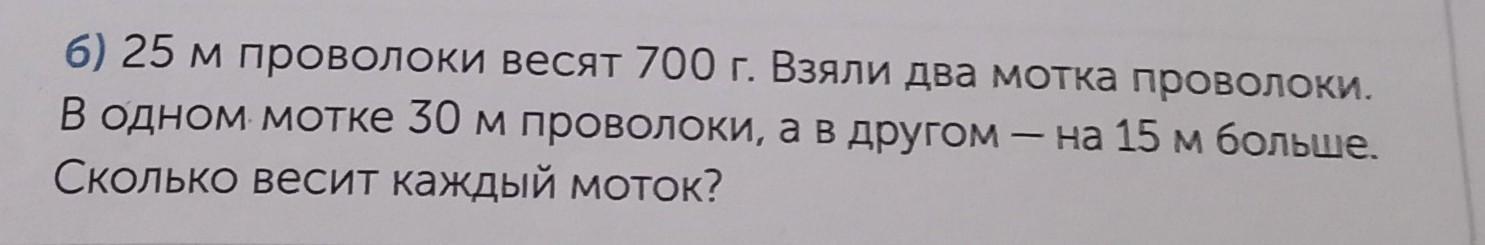 6) 25 м проволоки весят 700 г. Взяли два мотка проволоки, В одном мотке 30 м проволоки, а в другом - на 15 м больше. Сколько весит каждый моток?