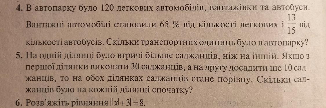 4. нехай легкових було x, тоді вантажних 0.65 x, а автобусів було у, тоді вантажних(13/15) у. За умовою всього 120 машин. Складемо і розв'яжемо систему.
