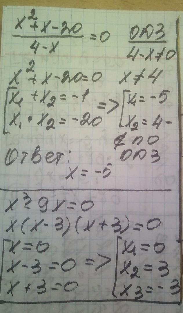 Розв'яжіть рівняння x²+x-20/4-x=0,. X³-9x=0