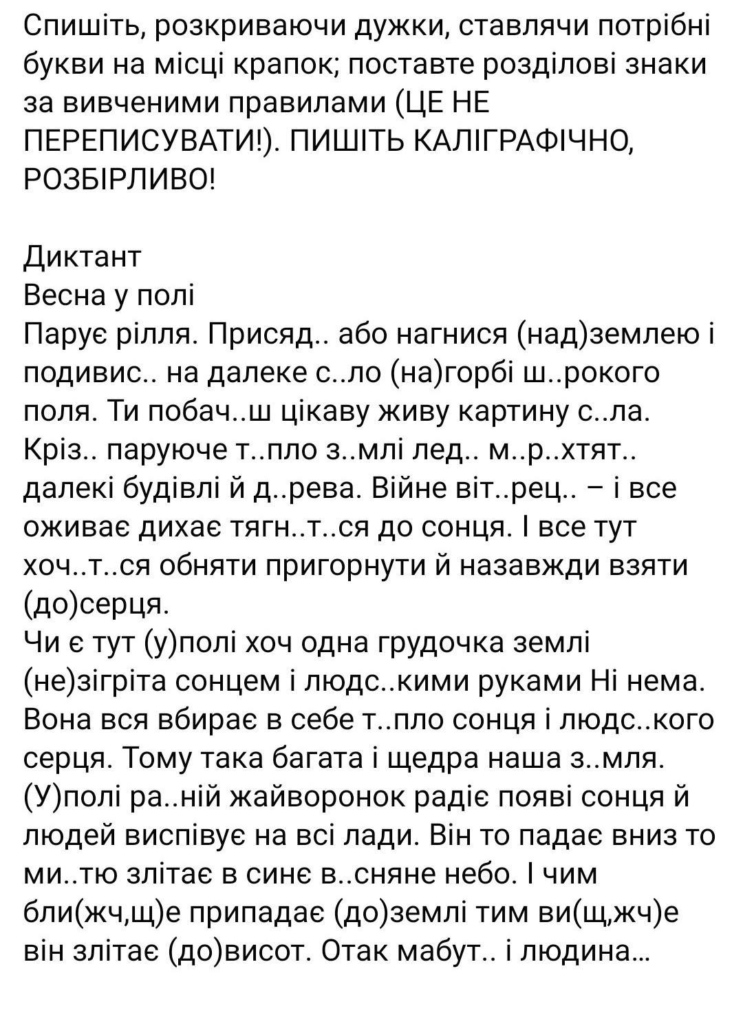 Чи є тут (у)полі хоч одна грудочка землі (не)зігріта сонцем і людс..кими руками Ні нема. Вона вся вбирає в себе т..пло сонця і людс..кого серця. Тому така багата і щедра наша з..мля.