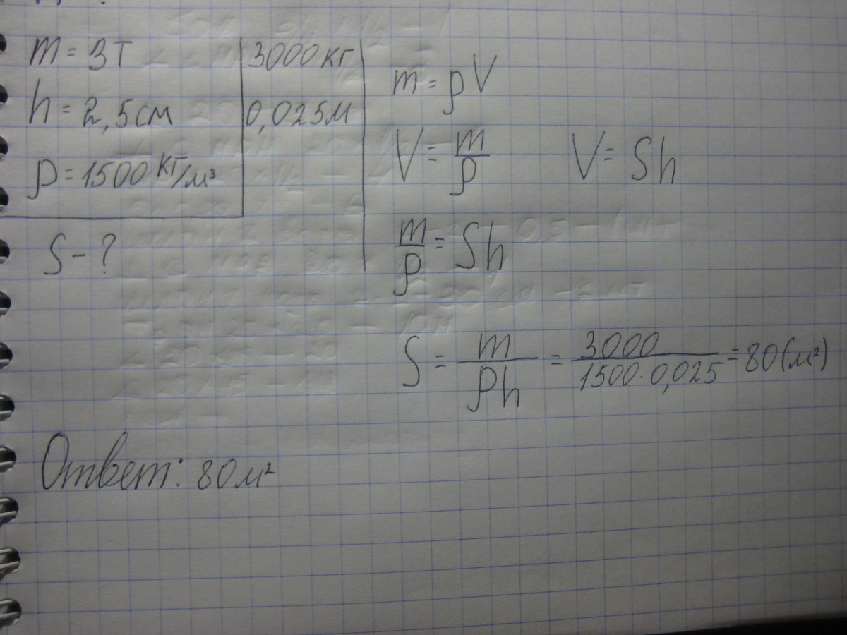 кузов грузовой машины заполнен песком, масса которого 3т. какую площадь можно засыпать этим песком так, чтобы толщина покрытия составляла 2.5 см?