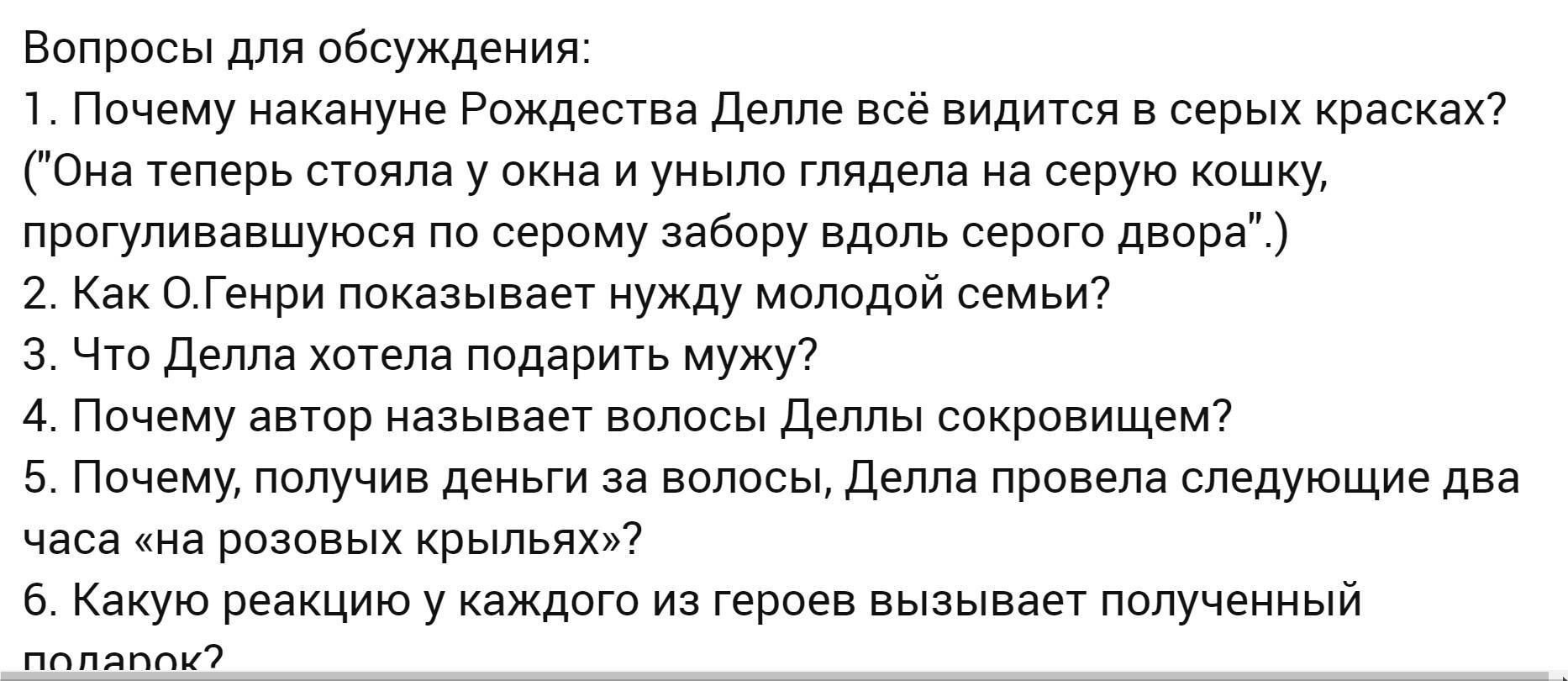 3,ланцюжок для годинника 4,бо вони для неї були дуже дорогі 5,вона з задоволенням вибирала подарунок чоловіку 6,бо белла продала волося а получила розчіски а чоловік продав годинник а отримав ланцюжок до нього