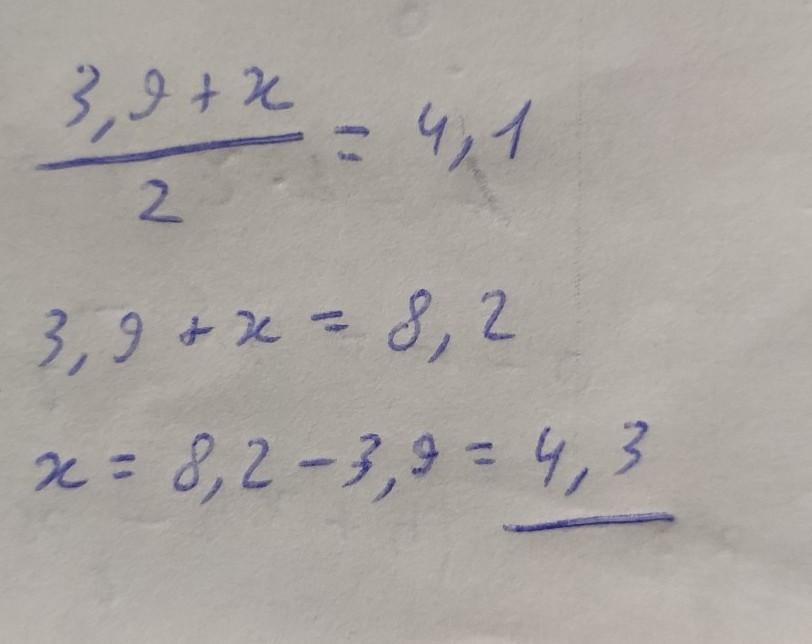 Середнє арифметичне двох чисел дорівнює 4,1. Одне з цих чисел 3,9. Знайдіть друге число.