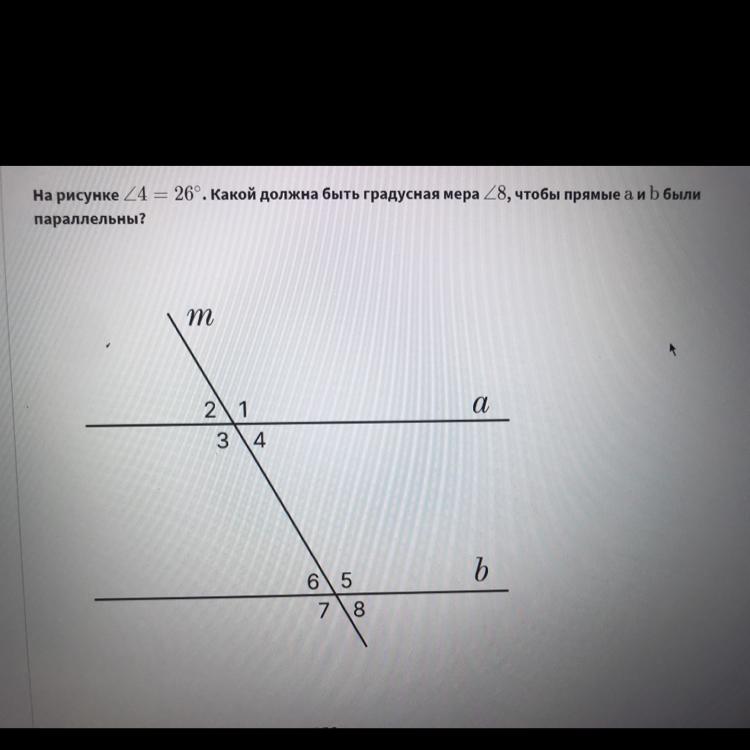 На рисунке угол 4 = 26°. Какой должна быть градусная мера угла 8, чтобы прямые а и б были