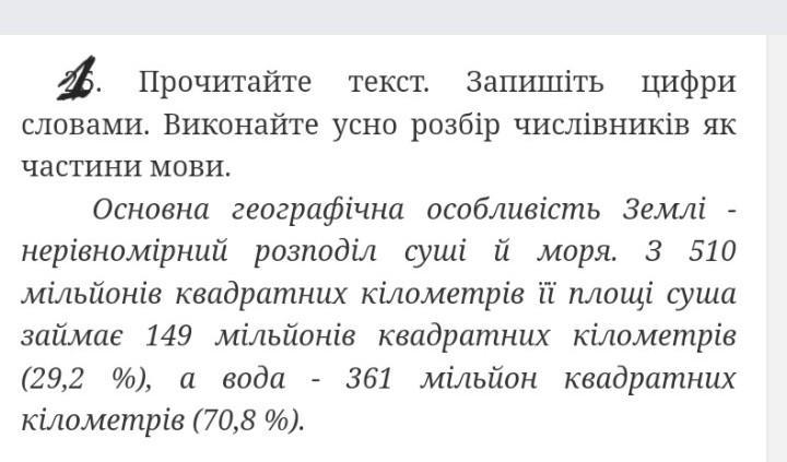 Основна географічна особливість Землі - нерівномірний розподіл суші й моря. З п'яти ста десяти мільйонів квадратних кілометрів її площі суша займає сто сорок дев'ять мільйонів квадратних кілометрів (двадцять дев'ять цілих і дві десятих відсотка), а вода - триста шістдесят один мільйон квадратних кілометрів(сімдесят цілих і вісім десятих відсотка).