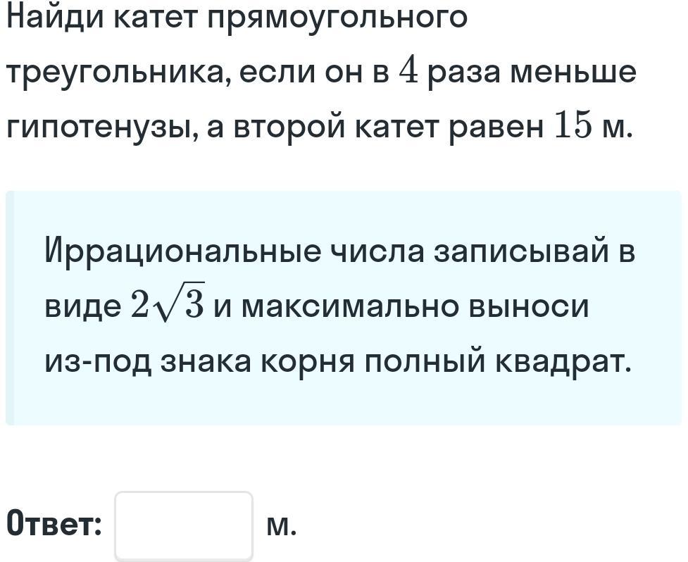 Пусть катет будет х, тогда гипотенуза будет 4х².