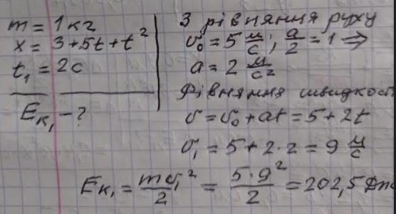 10.Рух тіла, маса якого дорівнює 1 кг, у СІ описується рівнянням х=3+5t+t^2.