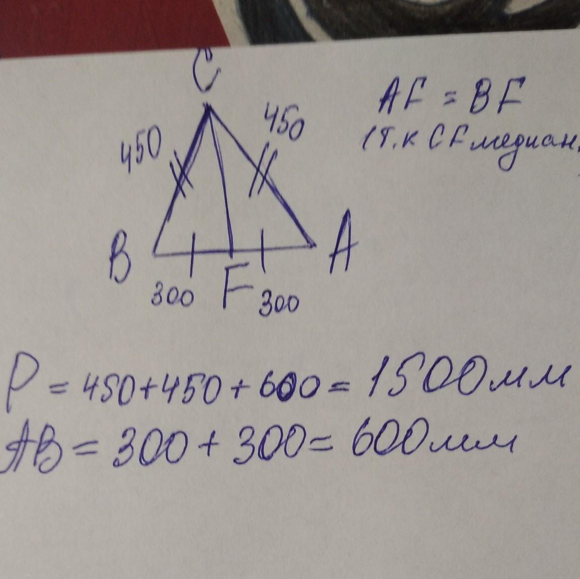 Вычисли периметр треугольника CBA и сторону BA, если CF — медиана, CB=AC=450мм иAF=300мм. BA = мм; P(CBA) = мм.