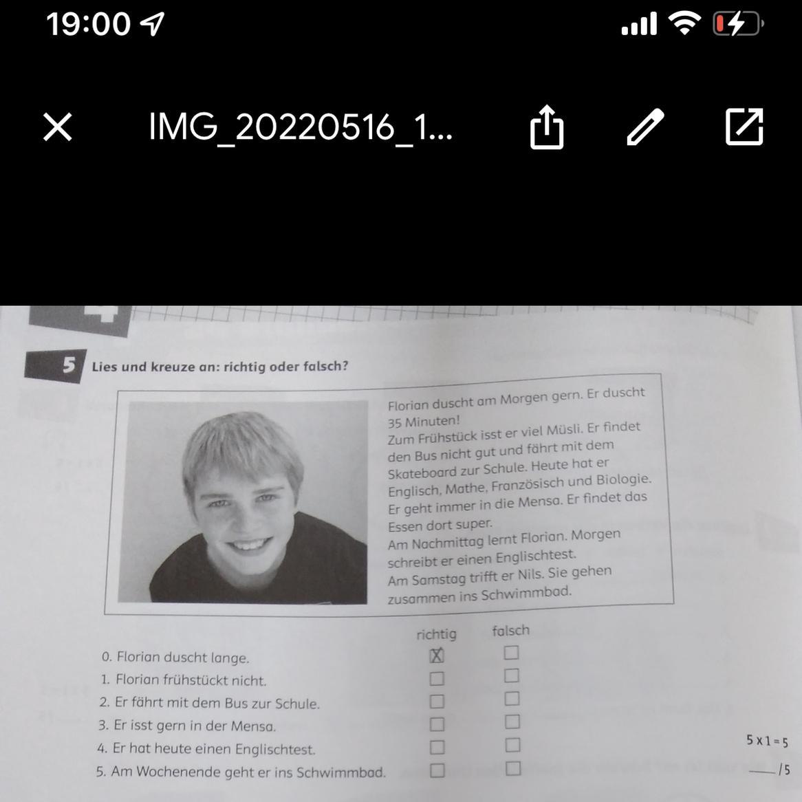 4. Falsch ("morgen schreibt er einen Englischtest")