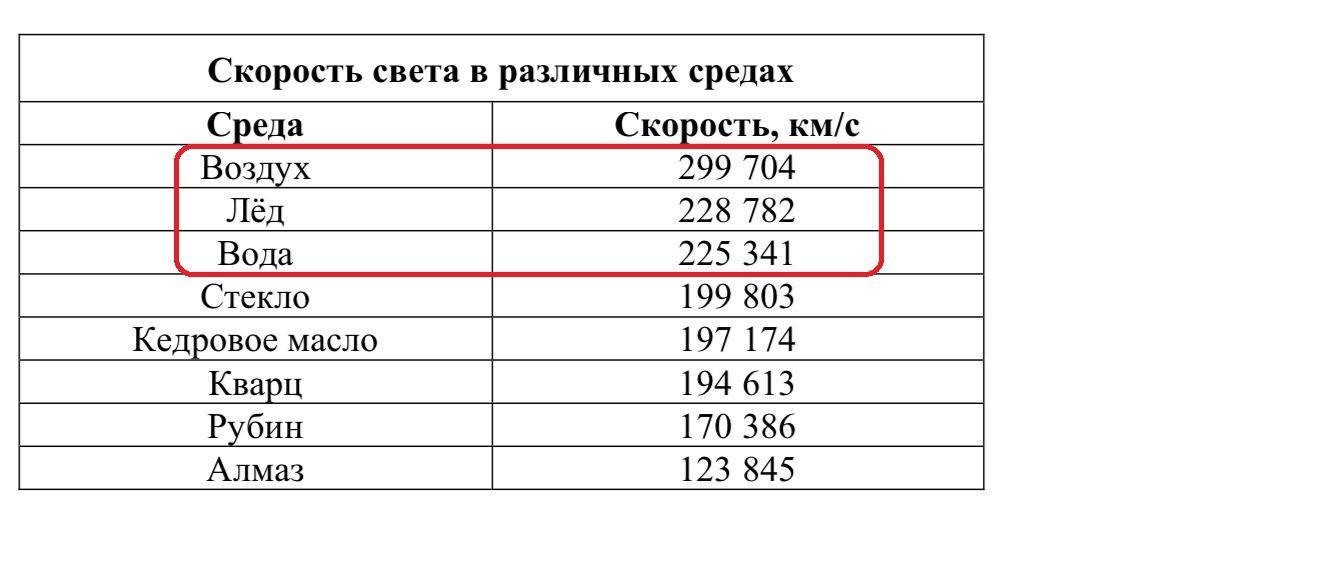 Известно, что солнечные лучи достигают Земли за 8 минут 20 секунд. Скорость света в вакууме 299 792 км/с. Пользуясь таблицей, определите, в каких средах свет пройдёт то же самое расстояние менее чем за 12 минут? Ответ кратко поясните.