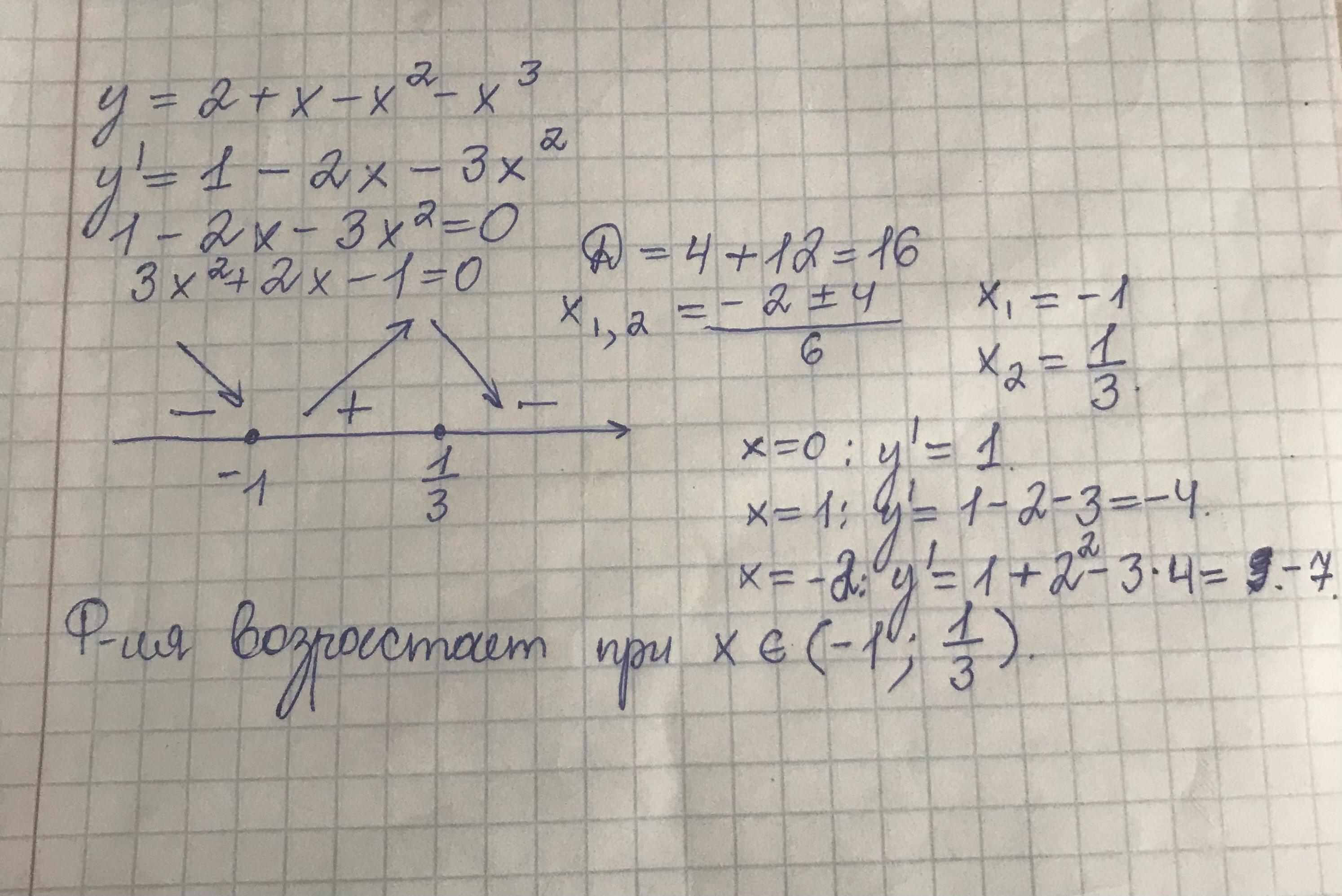 Знайдіть проміжки, на яких функція у=2+x-x²-x³ зростає