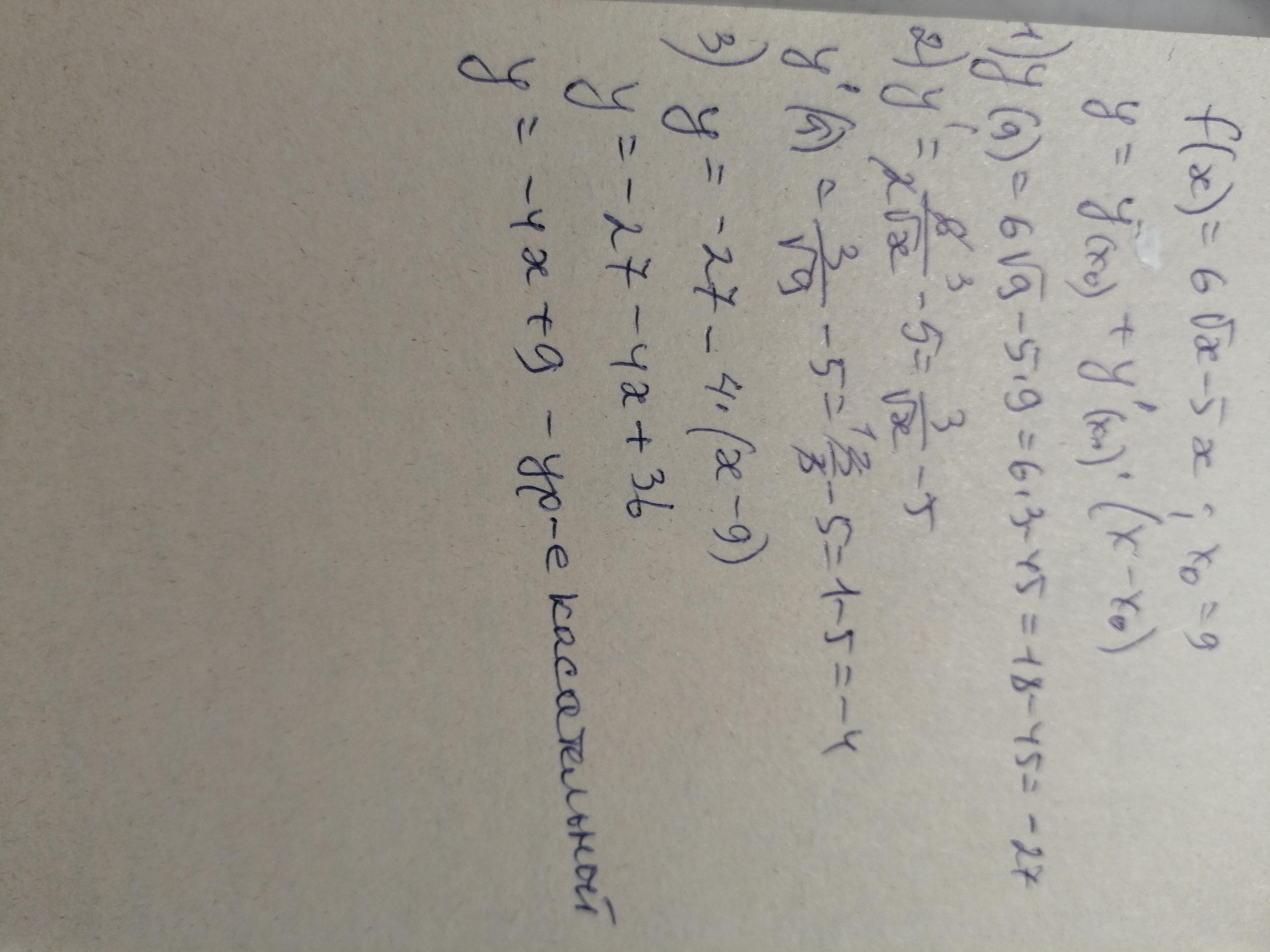 Знайдіть рівняння дотичної до графіка функції f(x)=6√x-5x у точці з абсцисою x0=9