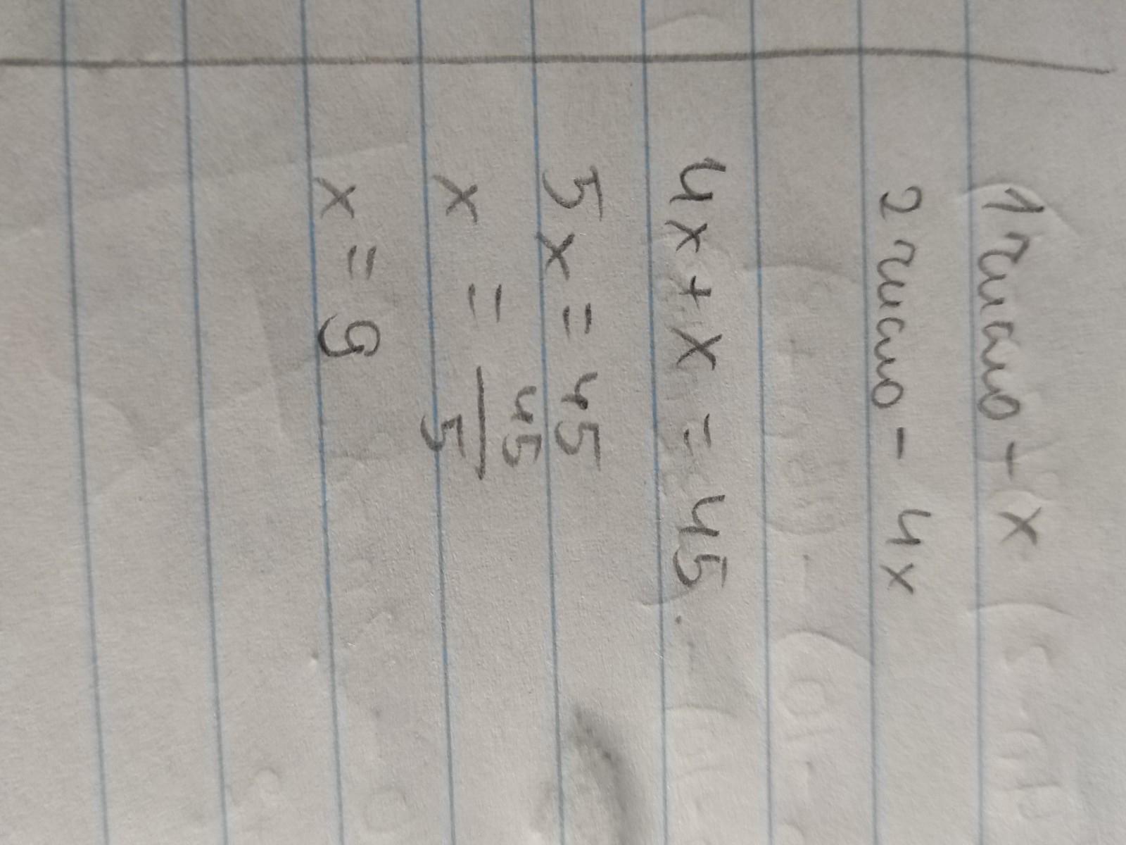 Сума двох чисел 45 . Одне з них у 4 рази більше, ніж друге. Знайти ці числа.