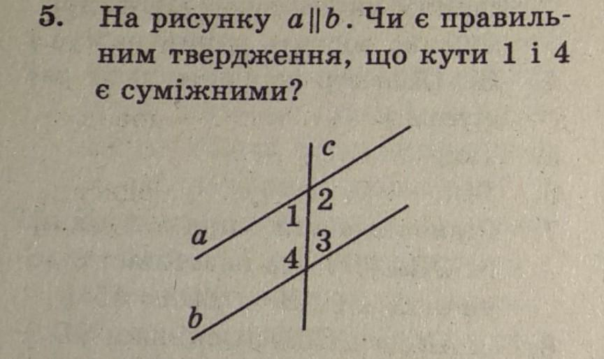 5. На рисунку a||b. Чи є правиль- ним твердження, є суміжними? що кути 1 і 4 1/2 3 Ь 4 5.