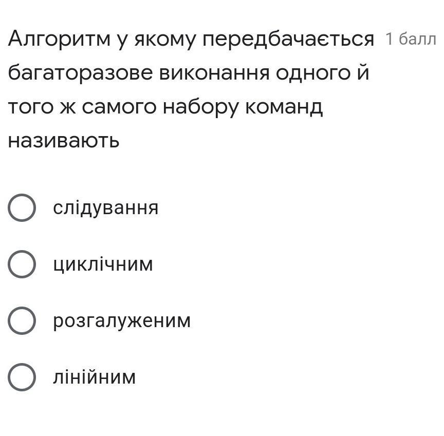 Алгоритм, у якому передбачається багаторазове виконання одного й того самого набору команд, називають циклічним.