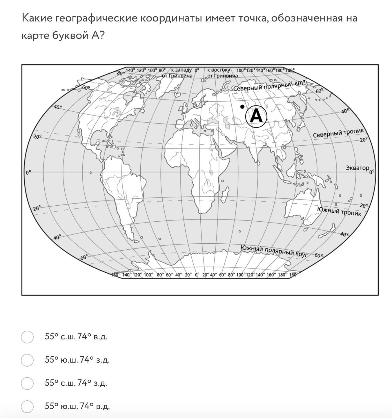 Какие географические координаты имеет точка, обозначенная на карте буквой А?