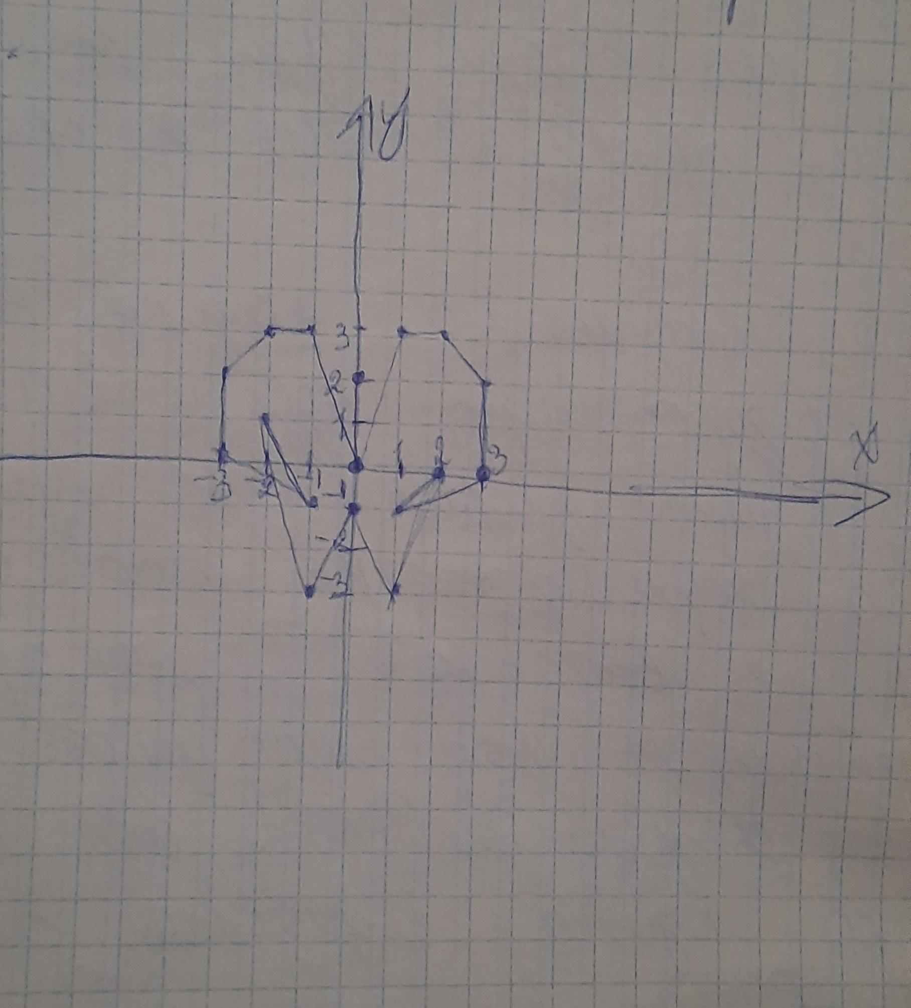 Потрібно намалювати малюнок на котдинатній площині (0; 2), (0; 0), (1; 3), (2; 3), (3; 2), (3; 0), (1; -1), (2;-1), (1;-3),(0;-1), (-1;-3), (-2; 1), (-1; -1), (-3; 0), (-3; 2), (-2; 3), (-1;3),(0; 0).