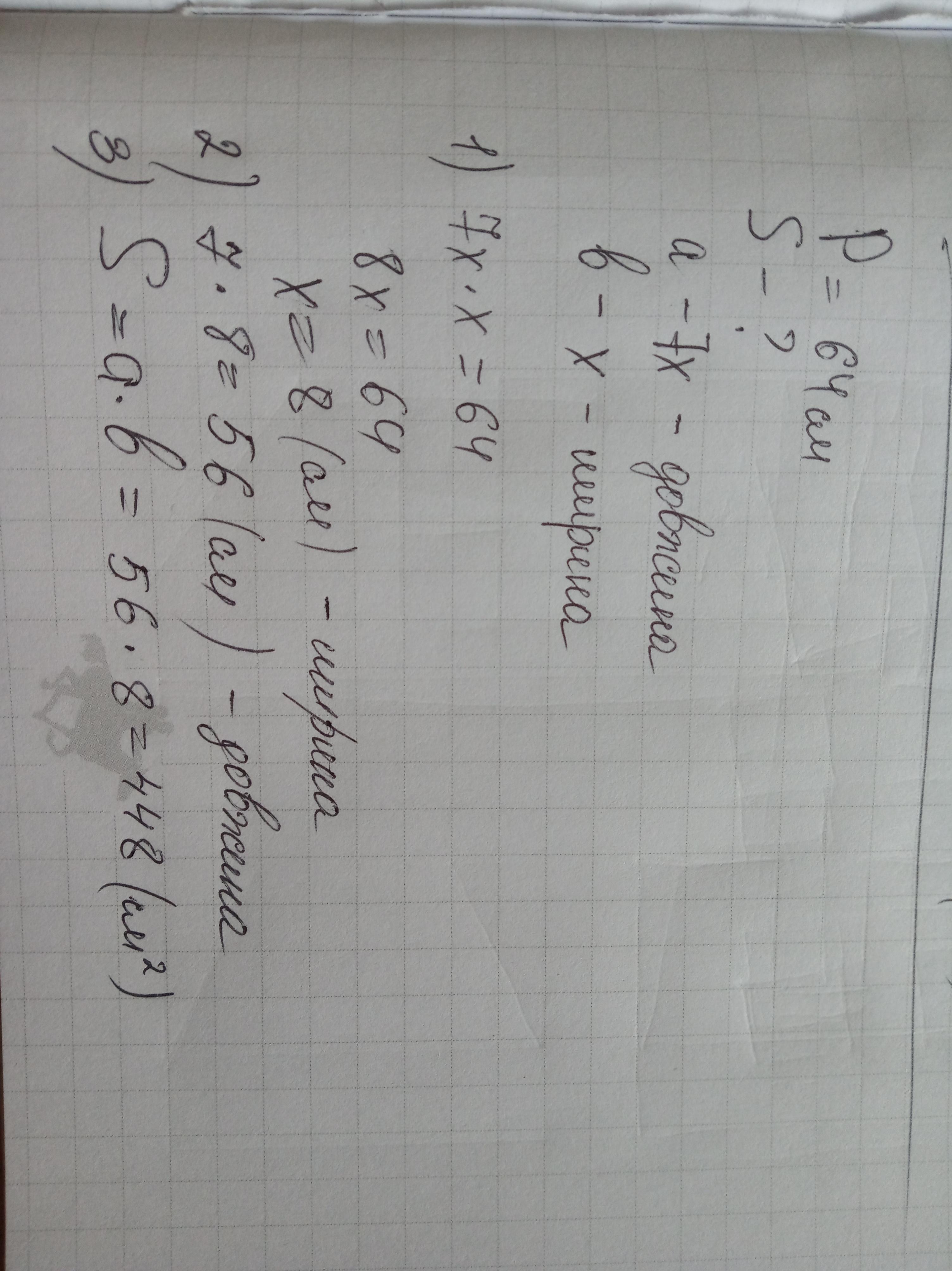 Периметр прямокутника прямокутника дорівнює 64 см. Знайдіть його площу якщо його довжина у 7 разів більша за ширину