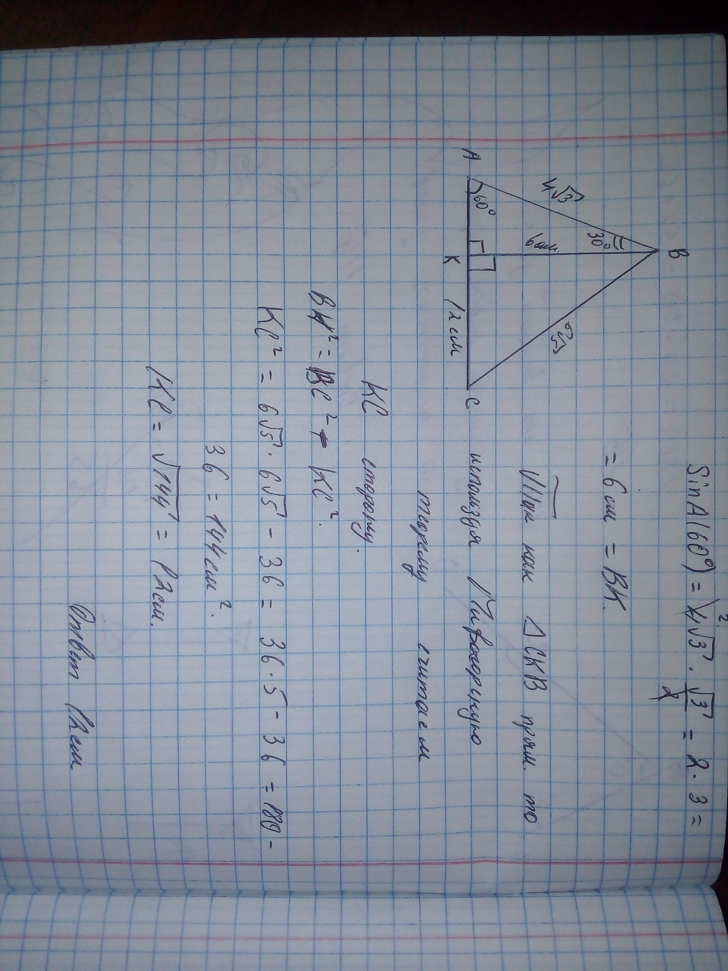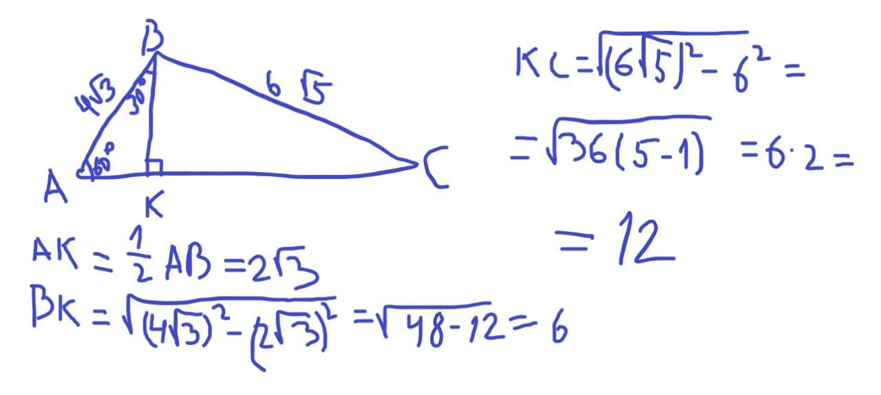 В треугольнике АВК sinA=BK/AB, отсюда находишь, что ВК=6. Потом по т. Пифагора для треугольника ВКС находишь СК, получается 12