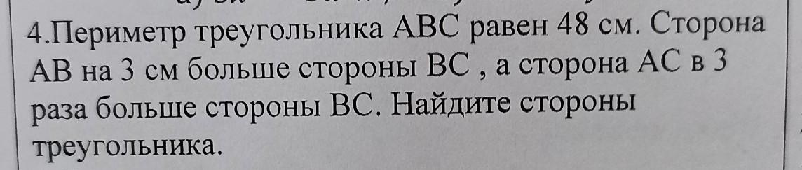 4.Периметр треугольника ABC равен 48 см. Сторона AB на 3 см больше стороны ВС, а сторона АС в 3 раза больше стороны ВС. Найдите стороны треугольника.