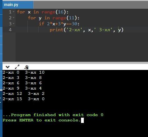 Цей фрагмент коду містить for x in range(16): for y in range(11): if 2*x+3*y==30: print('2-хл', x,' 3-хл',у) СРОЧНОООО!!!