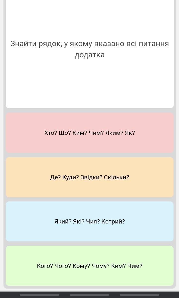 Знайти рядок, у якому вказано всі питання додатка Хто? що? Ким? Чим? Яким? Як? Де? Куди? Звідки? Скільки? Який? Які? Чия? Котрий? Кого? Чого? Кому? Чому? Ким? Чим?