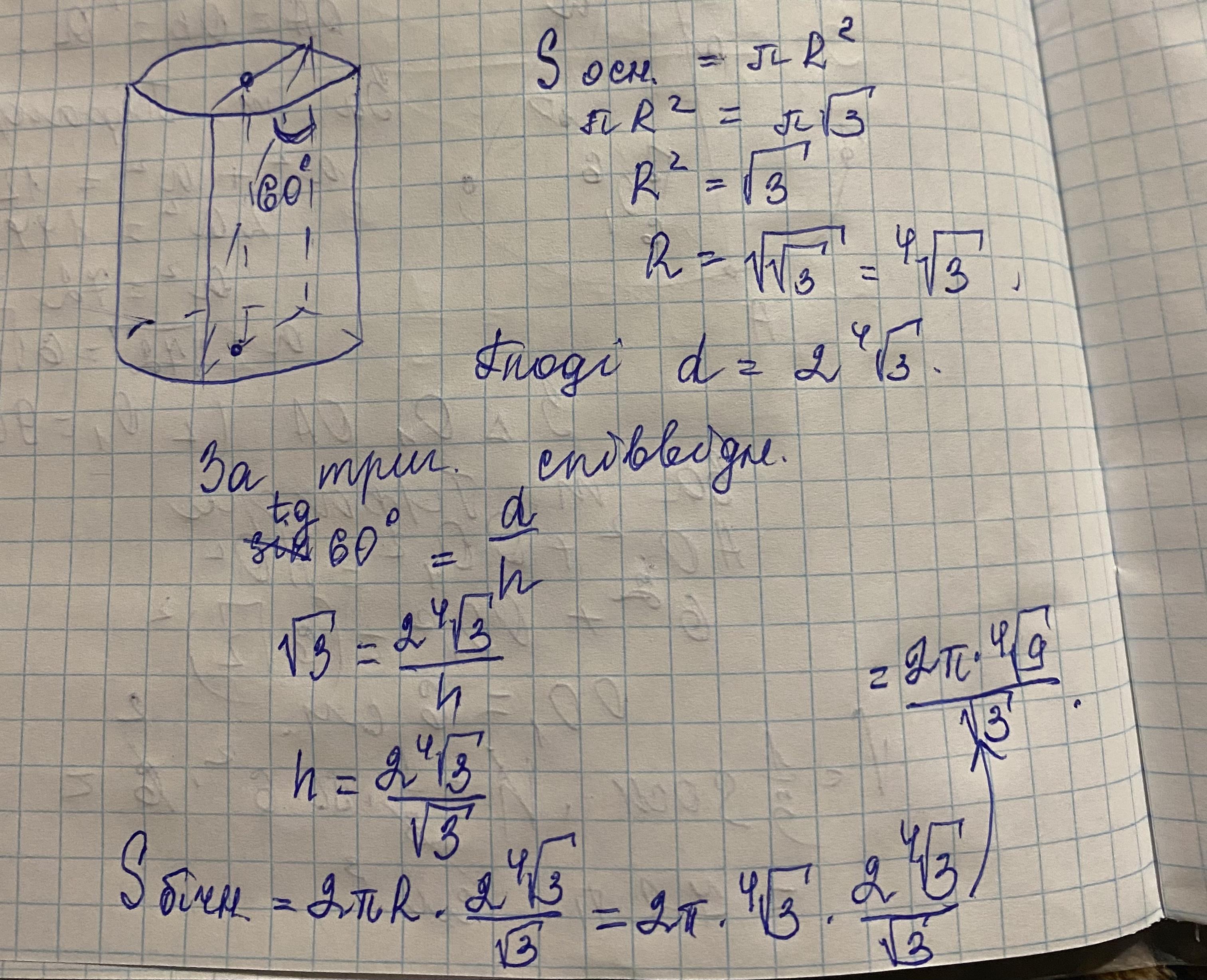 Кут між твірною циліндра і діагональю осьового перерізу 60° , площа основи циліндра π√3 (см³). Знайти S бічне