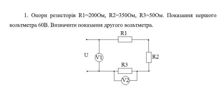 Опори резисторів R1=200Ом, R2=350Ом, R3=50Ом. Показання першого