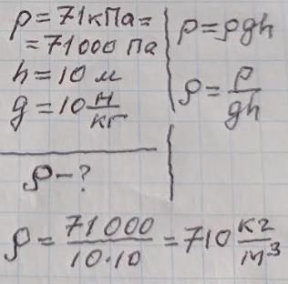 Яка густина рідини, яка на глибині 10 м , створює тиск 71 кПа?