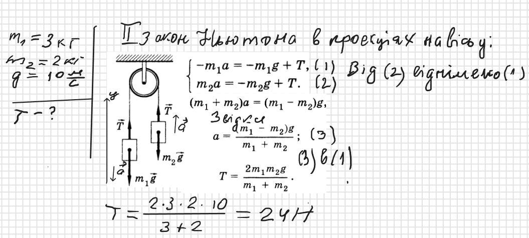 Два тіла масами 3 кг та 2 кг зв'язані між собою ниткою, яка перекинута через невагомий блок. Визначити силу натягу нитки.