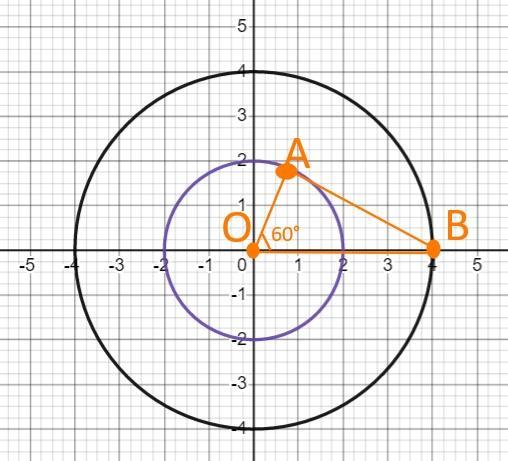 Точки A и B лежат на двух окружностях с общим центром и радиусами rA=2 см и rB=4 см соответственно. Величина ∠AOB (O — общий центр окружностей) равна 60∘. Найдите расстояние |AB|. Ответ запишите в сантиметрах, округлив до сотых.